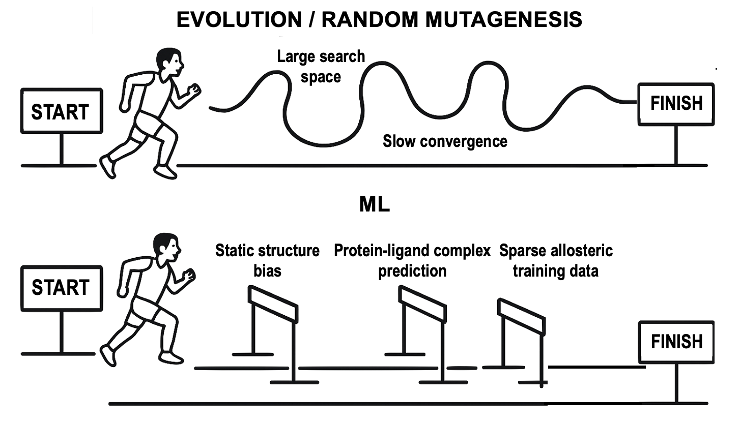 One of the conundrums facing protein engineers is whether (and how) to use directed evolution versus machine learning. On the one hand, directed evolution will generally get you where you’re going, as most selections and screens are directly for function. However, the path can be circuitous and inefficient (as above). In contrast, machine learning holds the promise of providing a more direct path to function, predicting the mutations that should work, rather than randomly chancing upon them. However, there are a number of hurdles that must be traversed (also ala above), and some of these hurdles are far from easily cleared.